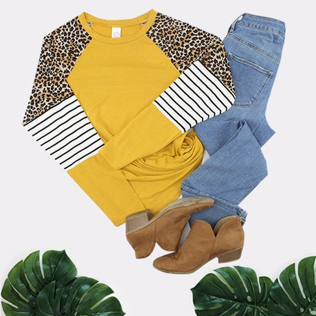 Mustard Leopard and Stripes Long Sleeve Top